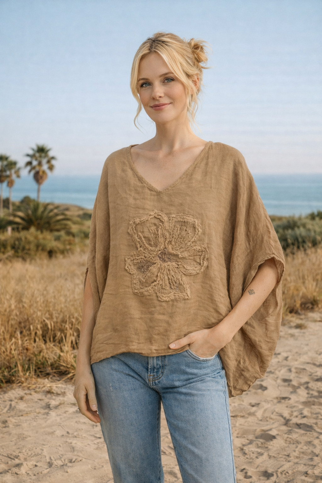 Airy linen top with a relaxed silhouette and delicate floral appliqué. Lightweight, breathable, and perfect for effortless everyday wear. Ideal for warm weather and casual California style.