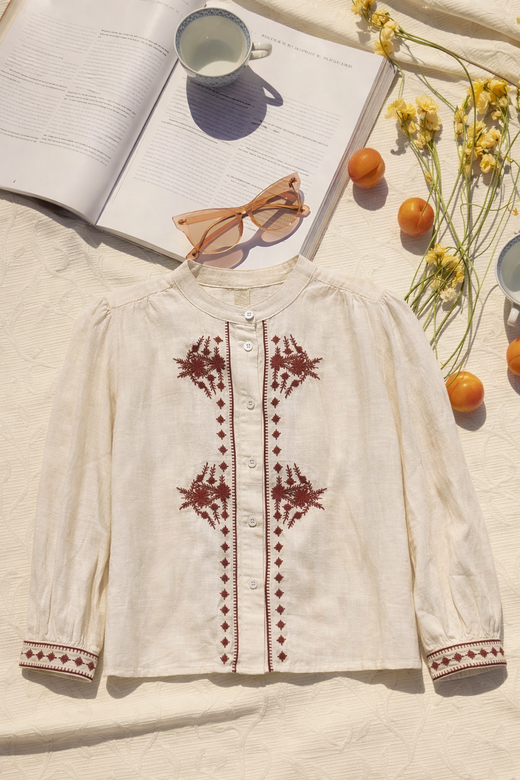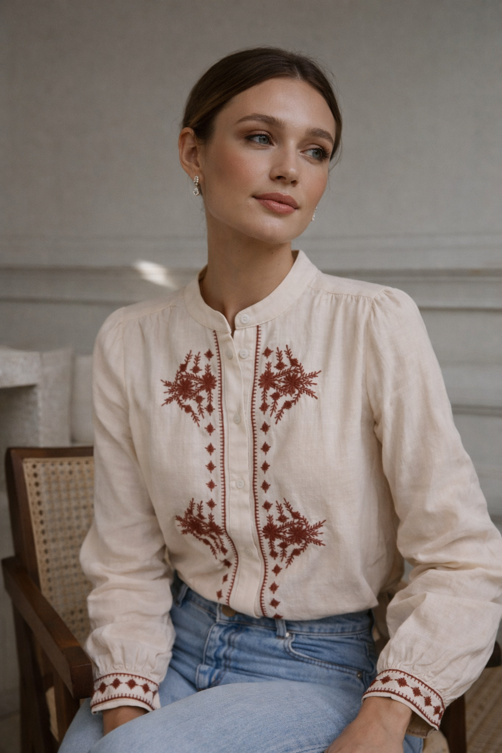Soft, sun-washed, and beautifully embroidered. This bohemian blouse captures the relaxed elegance of French style with an easy California attitude. Wear it tucked into denim or styled loose for a naturally chic, lived-in look.