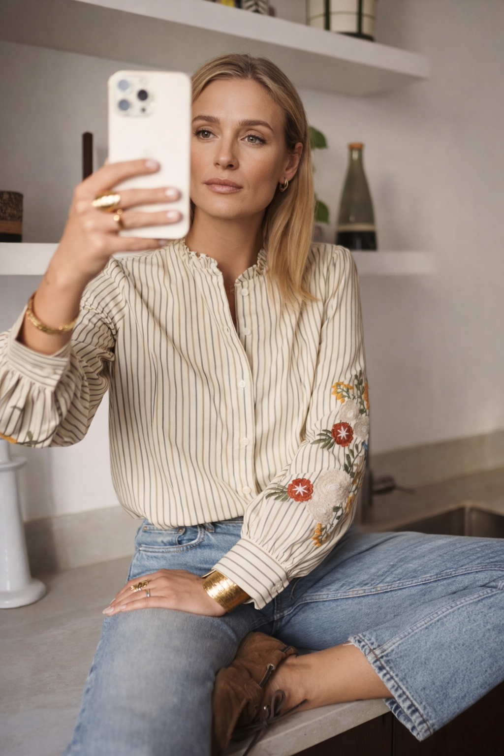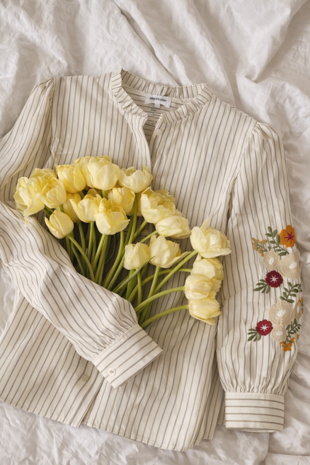 A softly striped beige blouse adorned with delicate floral embroidery and romantic details. Effortless, feminine, and timeless—this piece brings a touch of French charm to everyday California style. Perfect with denim, tailored pants, or layered for an understated chic look.