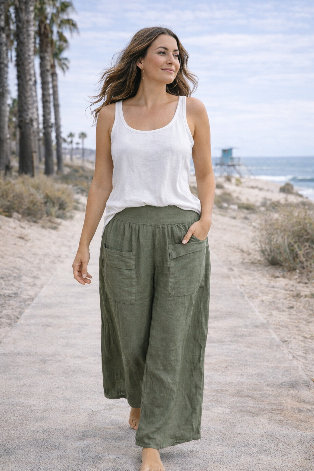 Lightweight wide-leg linen pants with a soft waistband and relaxed fit. Breathable, comfortable, and perfect for laid-back California days.