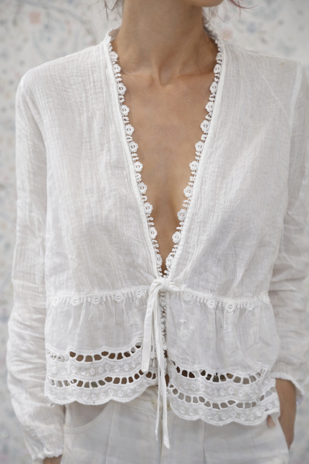 Soft, sun-washed, and beautifully embroidered. This bohemian blouse captures the relaxed elegance of French style with an easy California attitude. Wear it tucked into denim or styled loose for a naturally chic, lived-in look.